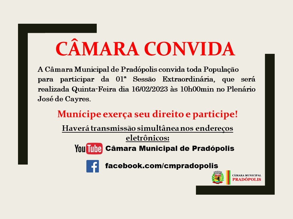 A Câmara Municipal convida toda a população a participar da 1ª Sessão Extraordinária, que será realizada dia 16 de Fevereiro (quinta-feira) ás 10 horas.