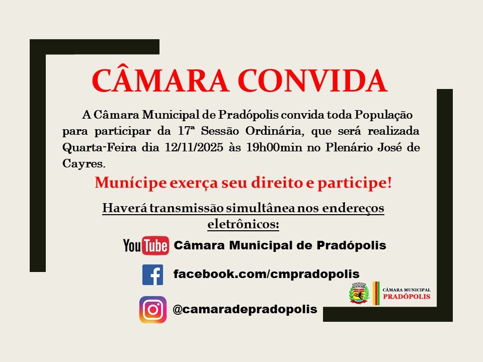 A Câmara Municipal convida toda a população a participar da 17ª Sessão Ordinária, que será realizada dia 12 de novembro (quarta-feira) ás 19h00min.